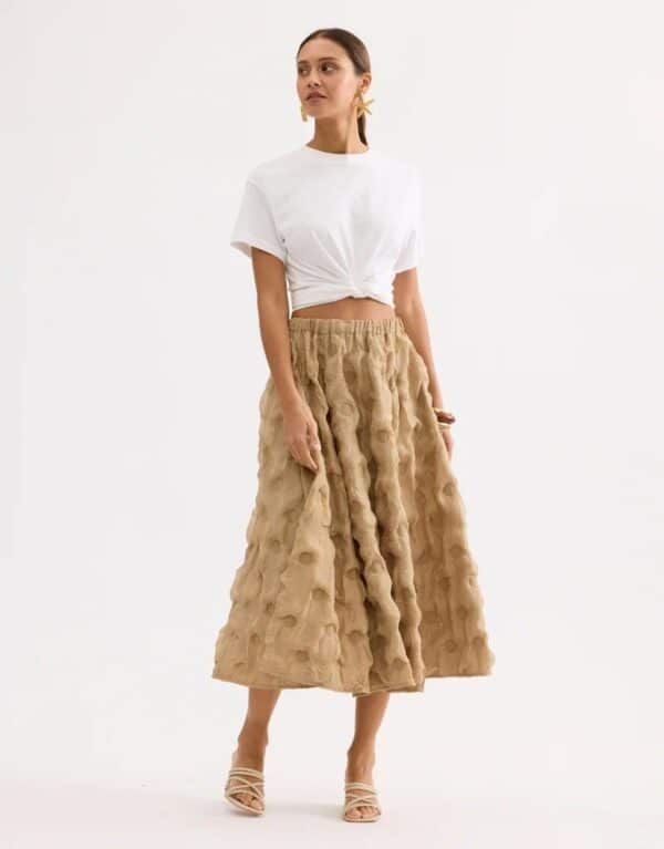 Midi lengte rok van Leo & Ugo met elastische tailleband, luchtige volume en textuur met subtiel reliëf,